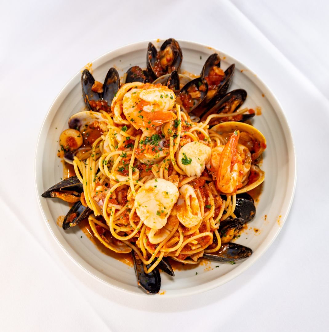Scallops, Shrimp, Mussels, little neck Clams calamari, over pasta with home made pomodoro sauce